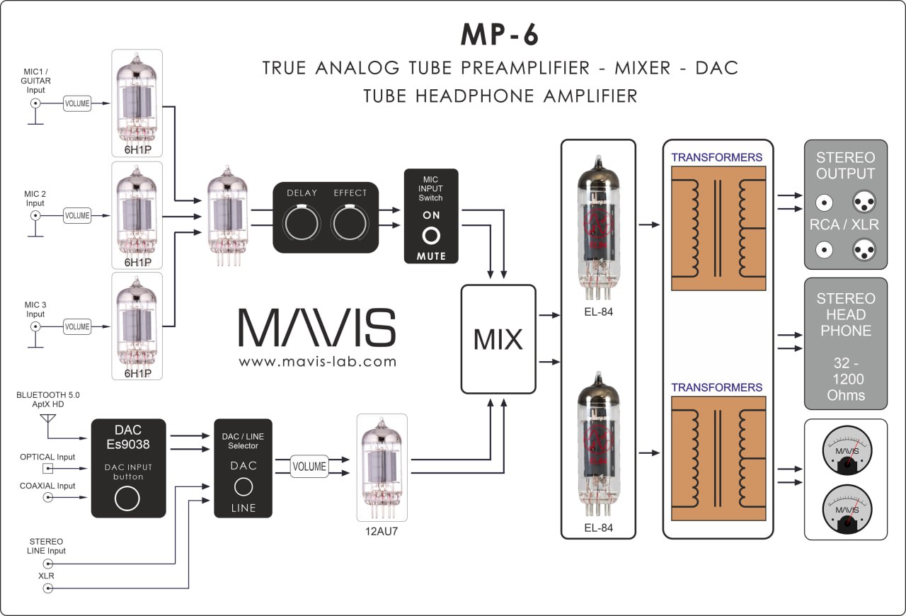 MAVIS MP-6 là bộ tiền khuếch đại đèn đa chức năng cao cấp “5 trong 1” độc nhất trên thế giới hiện nay. Thiết bị “5 trong 1” này bao gồm các chức năng: